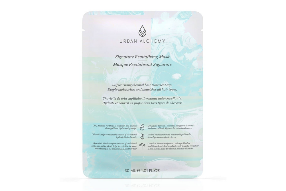 The Urban Alchemy Signature Revitalizing Mask is truly innovative as it is a self-warming hair mask that warms itself with the heat of one’s own scalp for deep penetration into the hair cuticle and scalp.